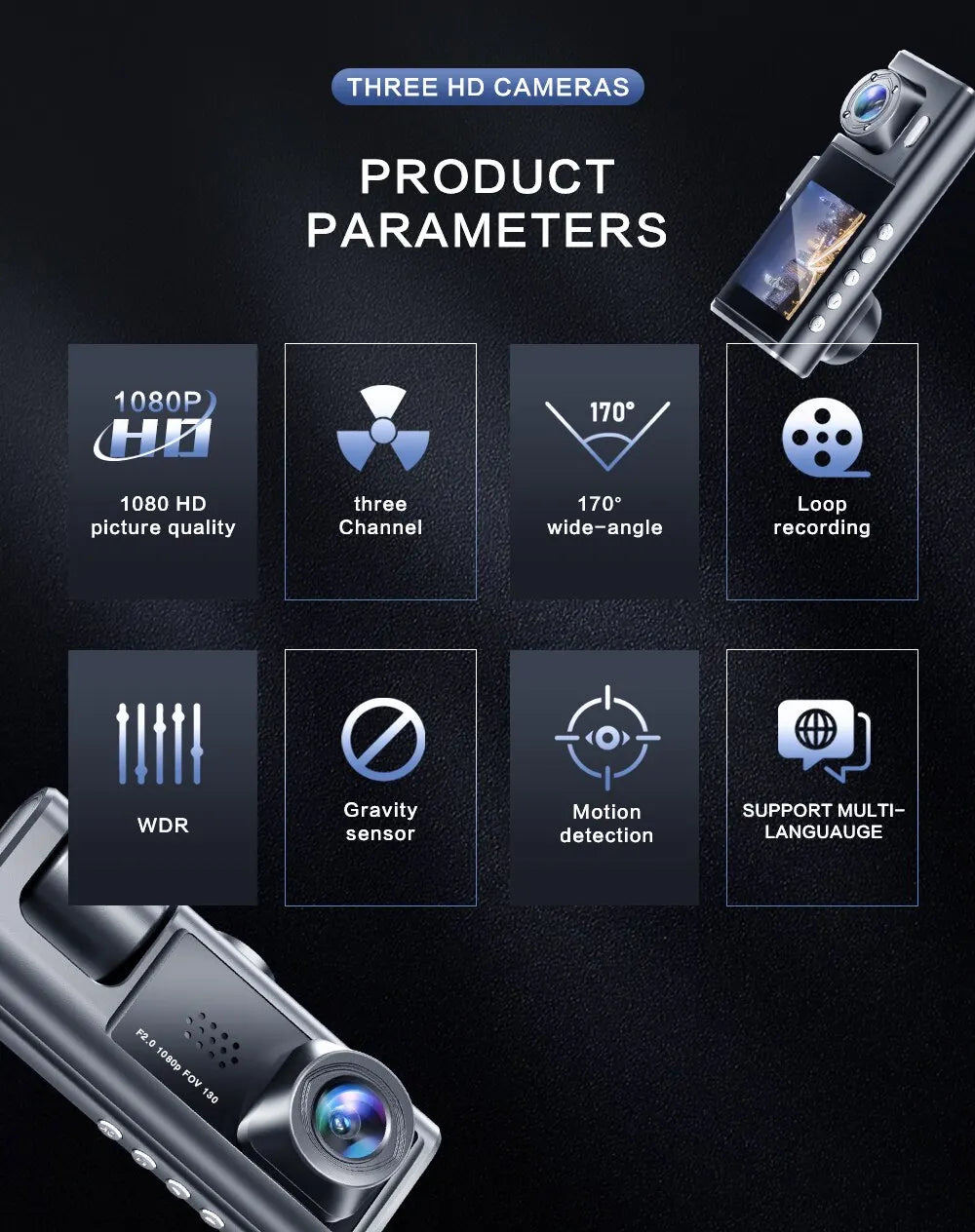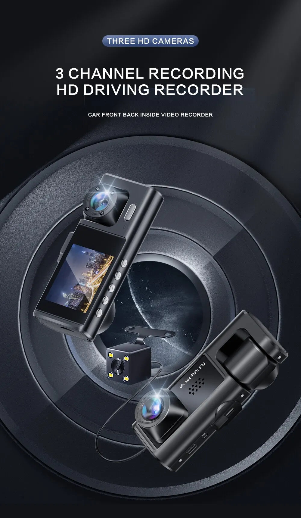 Get unparalleled protection on the road with our innovative 3-in-1 Dash Cam. Capture everything in crystal-clear quality with front, cabin, and rear cameras. Whether it's a scenic journey or a bustling city drive, every detail is recorded, giving you peace of mind and a reliable eyewitness in any situation.